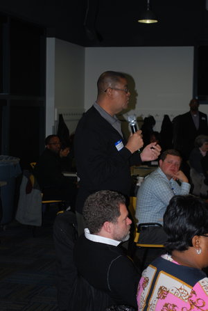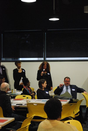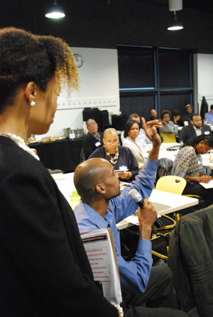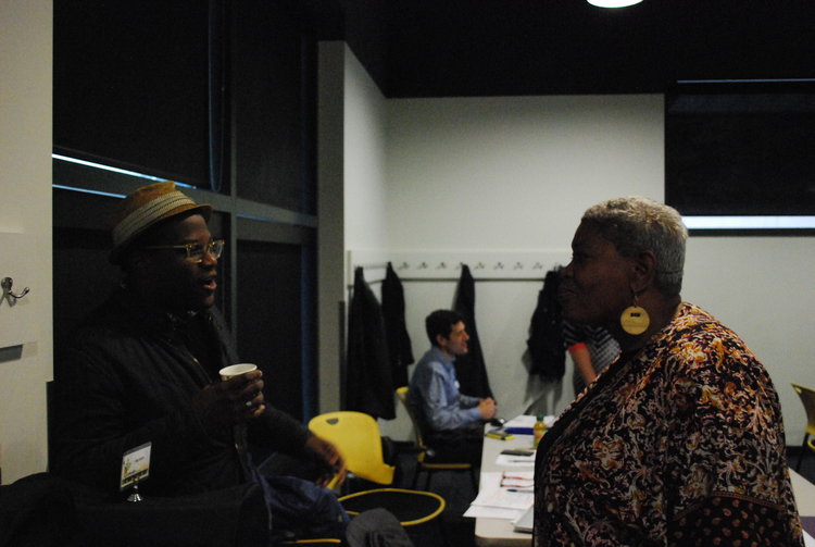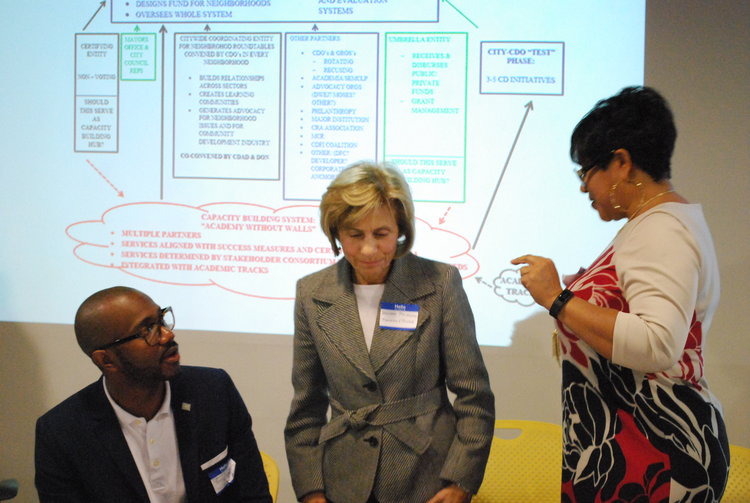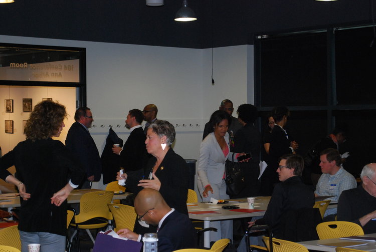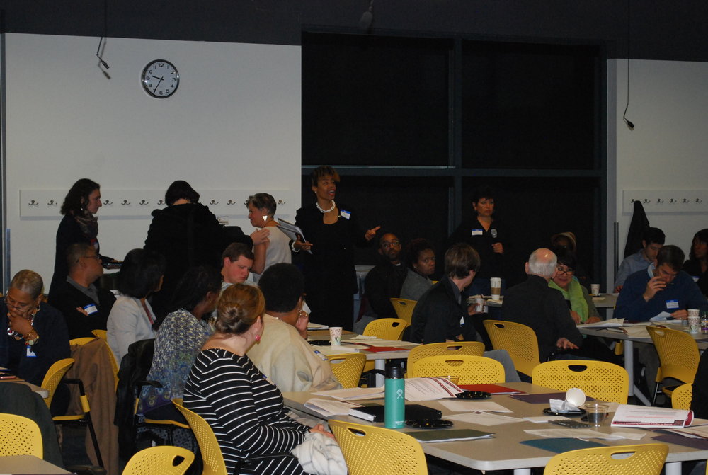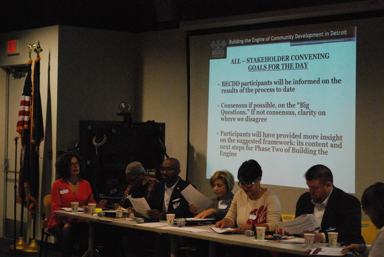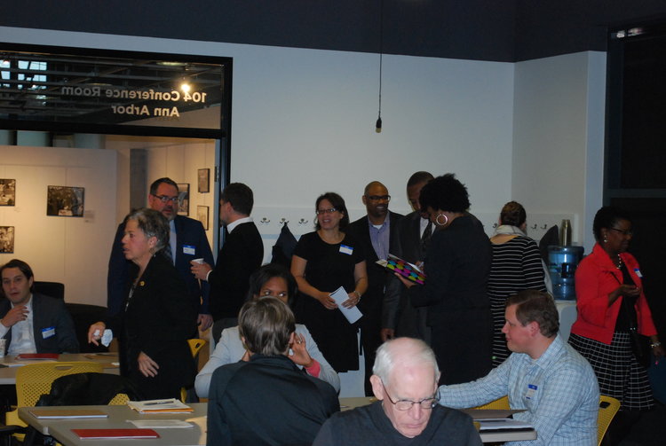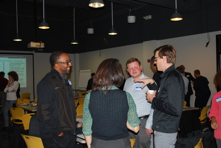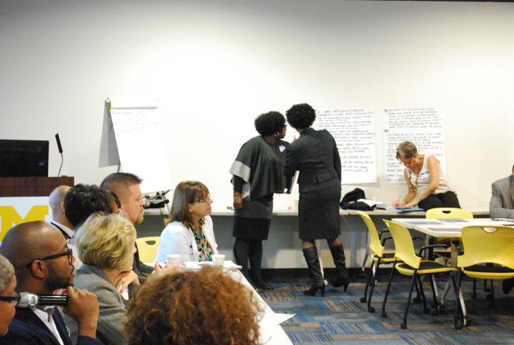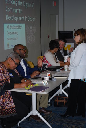 Photographs from the 2016 All Stakeholder Summit, convening at the UM Detroit Center. Sixty-three stakeholder organizations came together to hear from a panel of representatives from each of the Kitchen Cabinets. Stakeholders discussed work completed in their subcommittees on community development definitions, Framework for Neighborhood Success Measures and a Detroit Community Development System Structure.