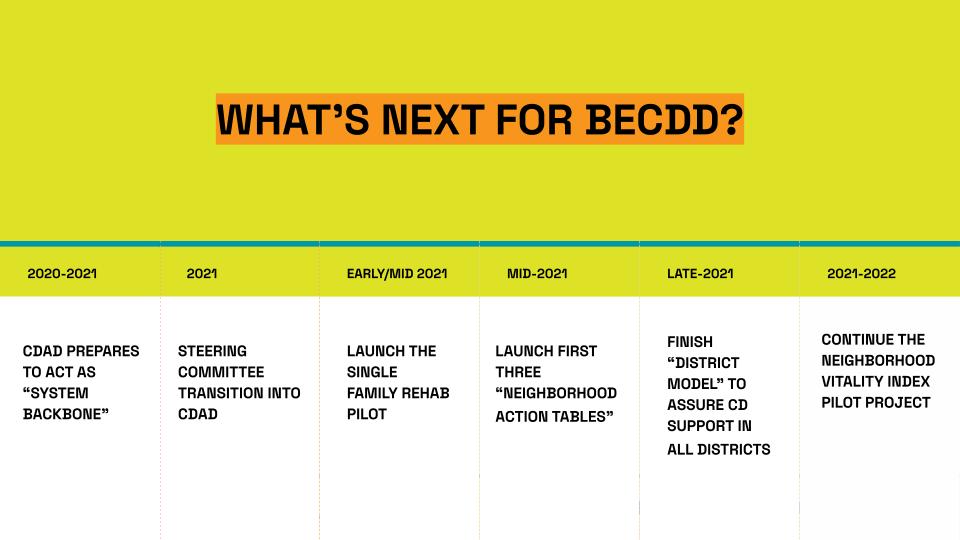 - Together, the key BECDD stakeholders are working together to identify resources to invest in all seven elements of this coordinated system – not just separate projects – to have a real impact on all Detroit neighborhoods.