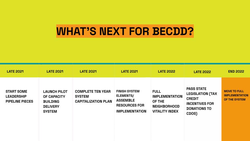 - By the end of 2022, we hope that the building of the system – including all seven elements – will be finished, with a seamless community development system that impacts all of Detroits neighborhoods.